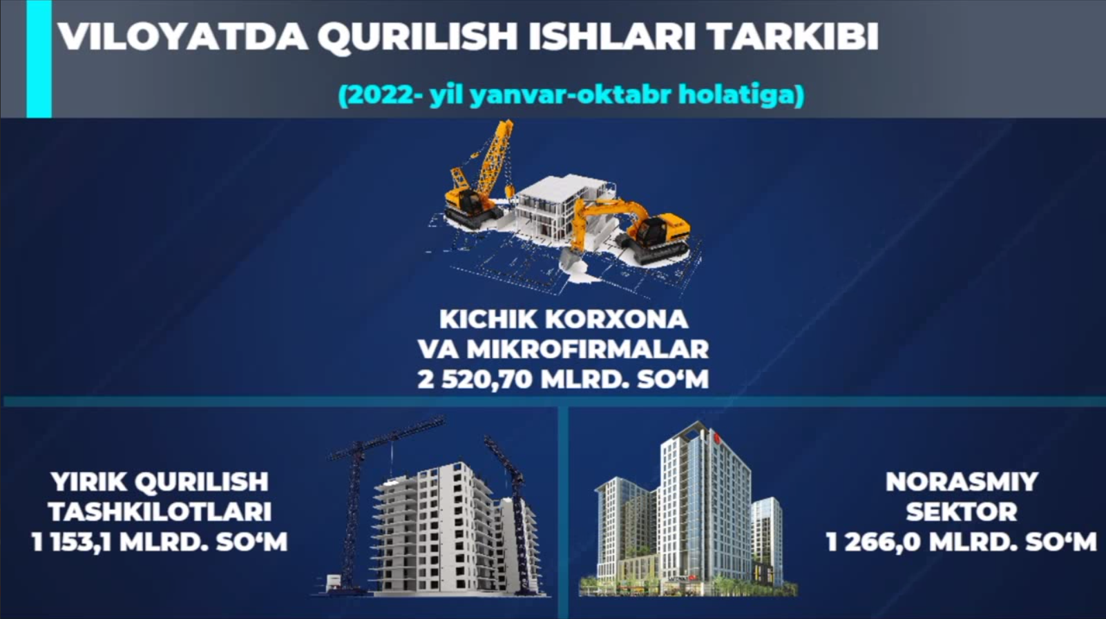 2022 yilning yanvar-oktyabr oyida viloyatda jami 4 939,8 mlrd. so‘mlik qurilish ishlari bajarilib, o‘sish surʼati 2021 yilning yanvar-oktyabr oyiga nisbatan 108,6 % ni tashkil etdi.