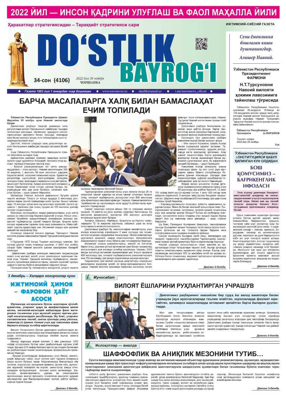 ❗️Yaqinda o‘zining 40 yillik yubiley to‘yini nishonlash arafasida turgan «Do‘stlik bayrog‘i» va «Znamya drujbi» gazetalari tahririyati davlat unitar korxonasi Navoiy viloyat hokimligining bosh nashri hisoblanadi. O‘zbek va rus tillarida alohida nashr qilinib kelinayotgan ushbu gazetalarda viloyatimizning ijtimoiy-iqtisodiy hayoti, hududda olib borilayotgan islohotlar, erishilayotgan yutuqlar va amalga oshirilayotgan yangi loyihalar muntazam yoritib boriladi.
